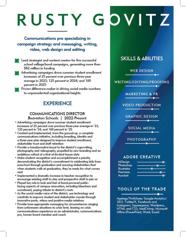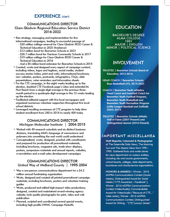 A writer first who has built himself into a well-rounded communications pro, amassing a ton of extensive content creation skills through specialized job experiences that advance the organization. Campaign Communications is a particularly strong suit, having served as lead strategist and content creator for four successful local school millage campaigns, generating more than $82 million in funding for those districts.